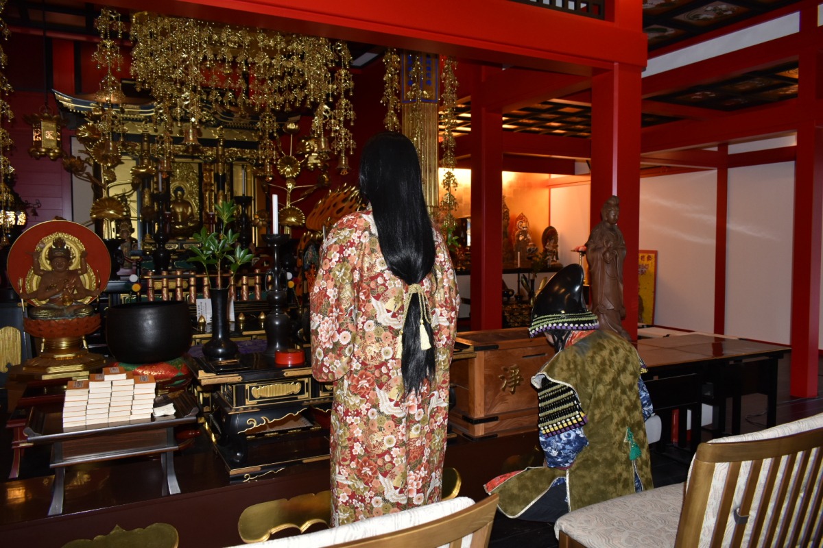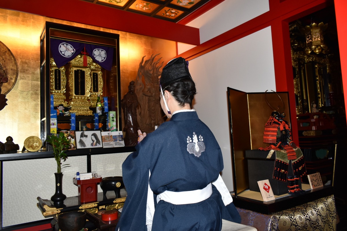 以前は3階建てのビルの中に本堂があったのじゃが、建物が解体され、昨年新たに朱塗りの柱に白壁、重層の宝形造りの屋根を持つ本堂が平地に落成したばかりで、新本堂での2回目のバレンタインデーを迎える。今回は岡山戦国武将隊の宇喜多直家と宇喜多秀家親子、そして秀家の妻・豪姫と、宇喜多家家臣の戸川秀安が、生まれ変わった「光珍寺」を尋ねた様子をご紹介いたそう。