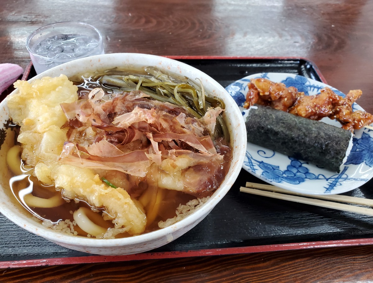 ●何といっても名物は『てんぷらうどん』です。まるでノートに敷く下敷きのような、とても大きなかき揚げが丼の上に乗っかった状態で提供されます! うどんももちもちしていて、出汁の効いたおつゆととても合います。他にも肉うどんやきつねうどんも大人気です。おむすび類やおでんもあります。(50代/女性/フリーター・アルバイト)