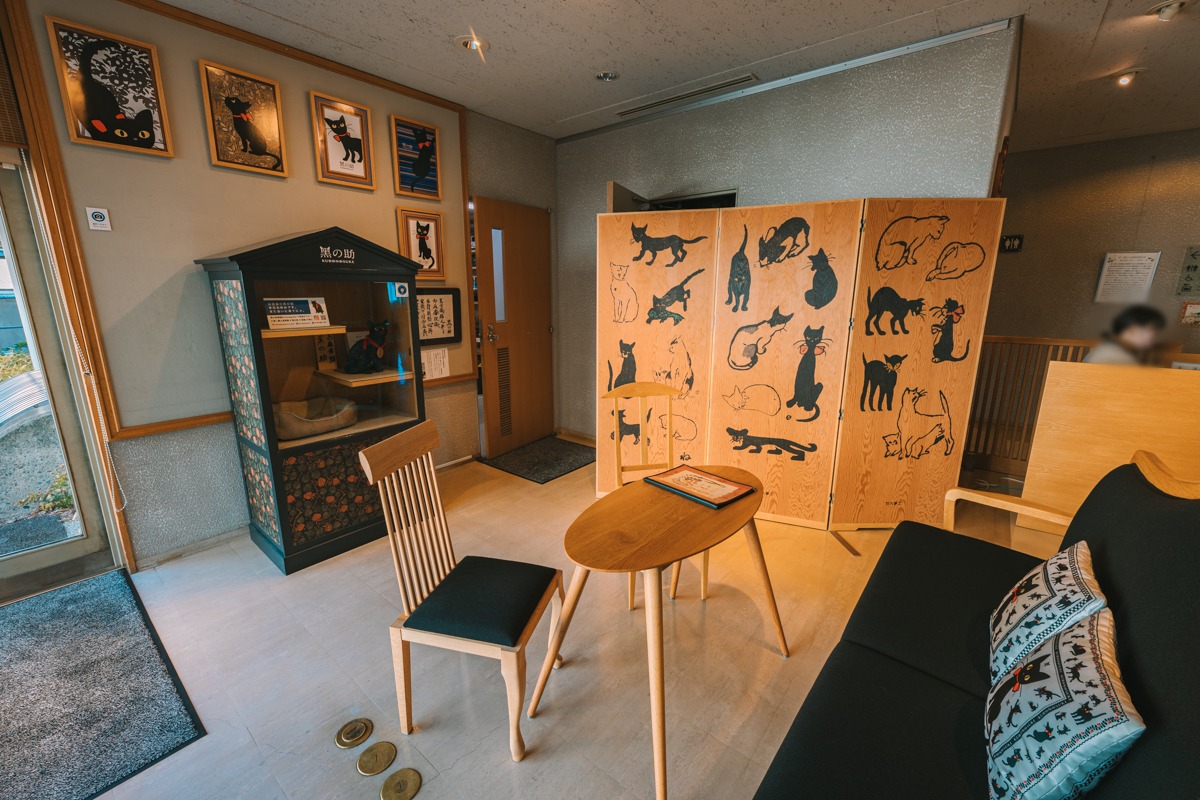 本館エントランスでは「黑の助」のパネルがお出迎え。