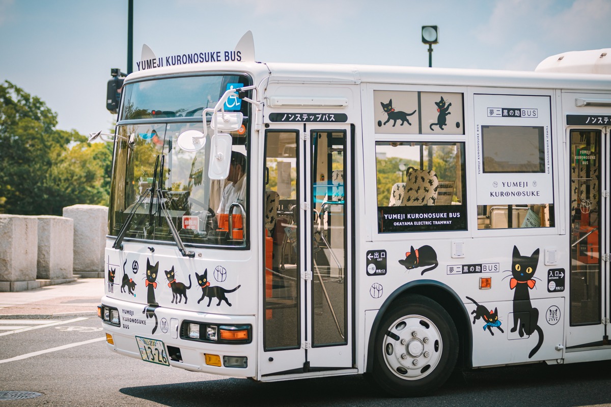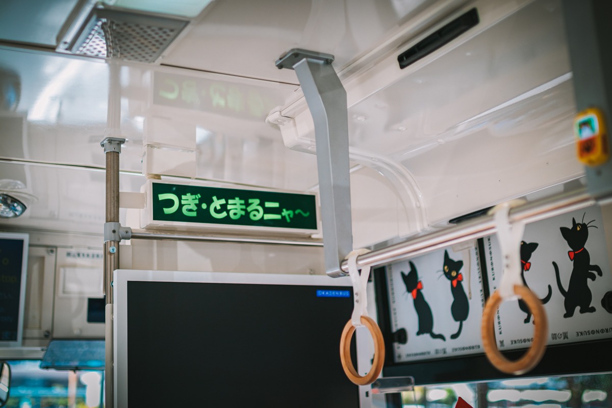 猫好きにはたまらない、水戸岡鋭治さんデザインの「夢二黑の助バス」です。耳もついております。