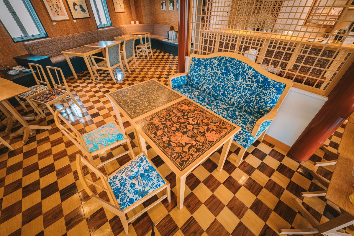 なんとこのカフェのテーブル、中の絵柄は夢二さんデザイン、縁は水戸岡鋭治さんのデザインなのだそうです。