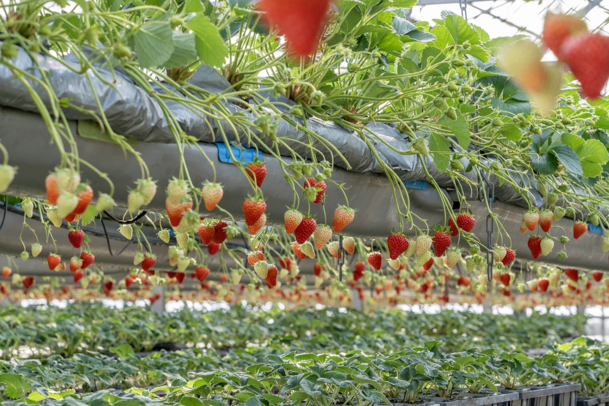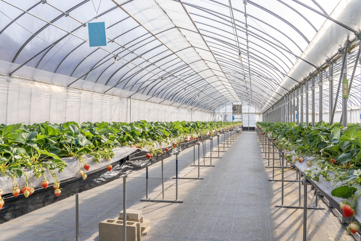 敷地内にあるハウスでは、鷲峰山麓の水を使って3種類のいちごが育てられています。ハウス内は足元がきれいに整備されており、通路はベビーカーや車いすも楽々通れる幅広。高設栽培なので摘み取りがしやすいのも嬉しいポイントです。