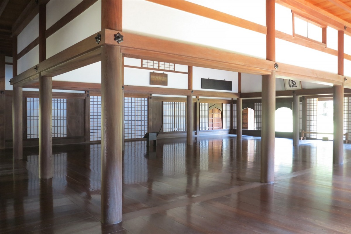 後世まで廃れさせないようにーとの池田公の願いを受けて、津田さん頑張りました。当時の技術の粋を尽くして、頑丈で壮厳な建物を完成させたのです。入母屋造り、しころ葺きの大屋根、丸く太い柱はヒノキ、木材は腐敗を防ぐため漆が塗られています。今なお磨き込まれている床は、鏡のように外の光を反射させ、その神聖な空気にため息が出るほど。