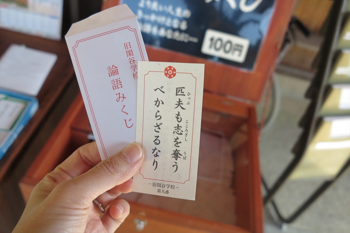 閑谷学校らしいグッズが多数販売されているのを見るのも楽しみの一つ。こちらは「論語みくじ」といって、1回100円で、論語の名言を引くことができます。私が引いたのは「匹夫も志を奪うべからず」。誰にも志は奪うことはできない…というアツい言葉。正直、胸にグッときますので大変オススメ。