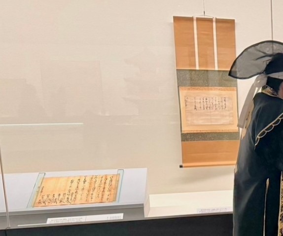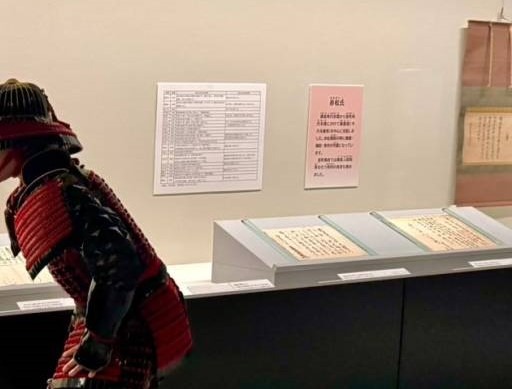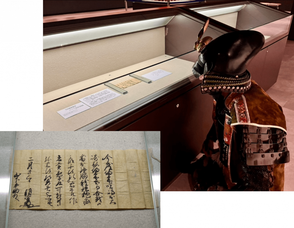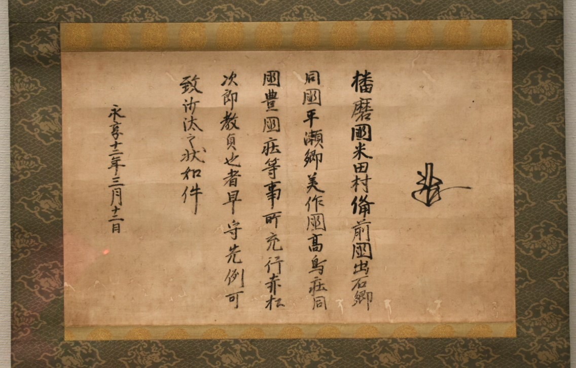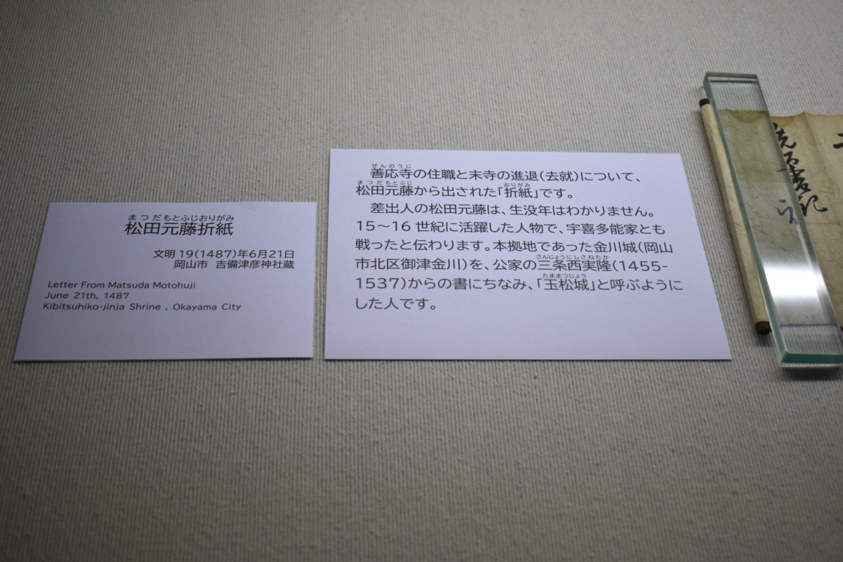 応仁の乱では細川氏の東軍についたため、山名氏を追い払い返り咲いたのじゃ。他に「赤松政則書状(あかまつまさのりしょじょう)」も展示されており、中央の室町幕府と結びつきながら勢力を拡大、継続していったことがわかるのじゃ。
