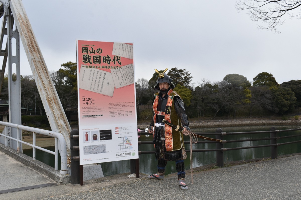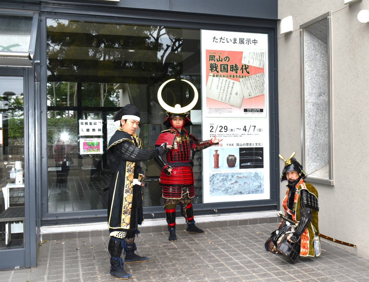 岡山の戦国武将「宇喜多を大河ドラマに!」と岡山市が名乗りを上げ、今県内で戦国時代が注目されつつある。しかし、歴史好きな人の間でも「岡山の戦国時代は難しい」「ややこしい」という声をよく聞き及ぶ…。そんな中、岡山県立博物館ではテーマ展として岡山の戦国時代が取り上げられておる。岡山戦国時代を第一級史料を見ながらストーリー仕立てで実感できる展示内容じゃ。この展示会の初日に、岡山戦国武将隊の宇喜多直家、宇喜多秀家、宇喜多家家臣・戸川秀安の3人が見に行って参った。その様子をご紹介いたしましょう。