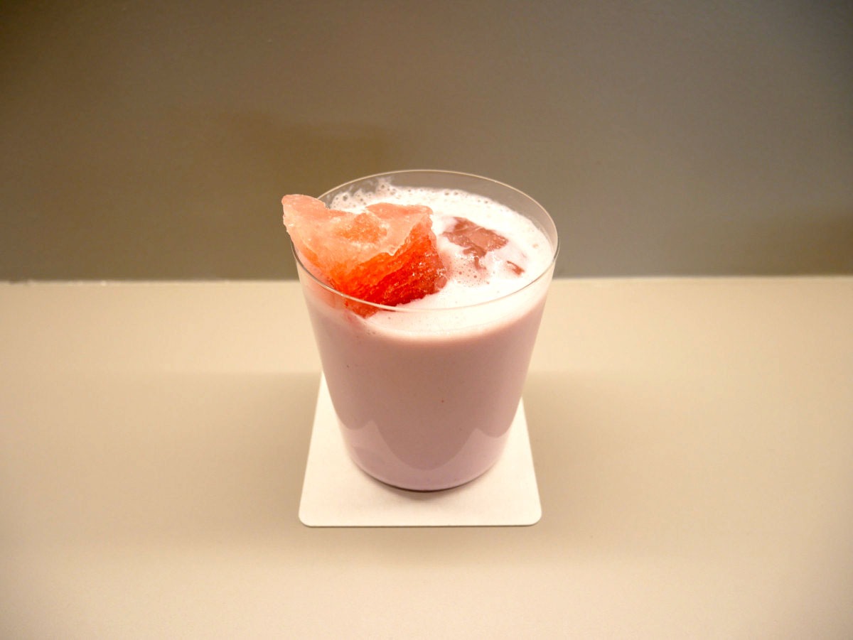 淡い桃色の水晶、ローズクォーツをイメージした氷は、グラデーションが美しく、ドリンクから飛び出る存在感。いちごのジュレが入っていて、すべて店内で手作りしています。溶けて形が変わっていく様も癒されます。ローズクォーツの石言葉は「愛」や「優しさ」、「美しさ」と言われていて、恋愛運アップにもよく選ばれる石だそうです。ホワイトデーにぴったりですね。