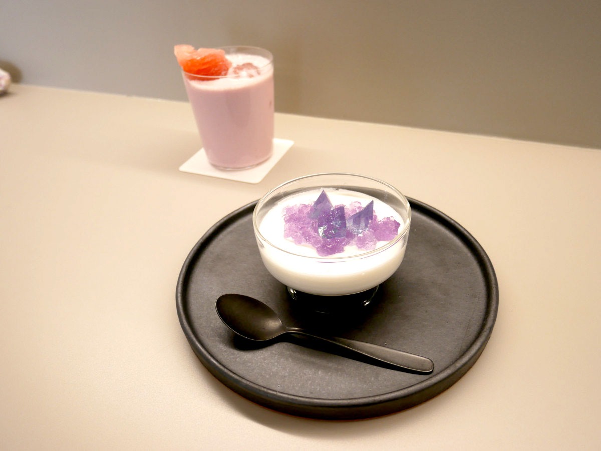ぷるぷるとした質感と淡い紫色のジュレが美しい印象です。アメジストをイメージしたジュレと琥珀糖がトッピングされていて、異なる食感が楽しい。ほのかにレモンの風味も感じられ、甘いドリンクとの相性も抜群です。アメジストの石言葉は「真実の愛」。「ローズクォーツの苺オレ」との組み合わせは、スタッフのおすすめです。