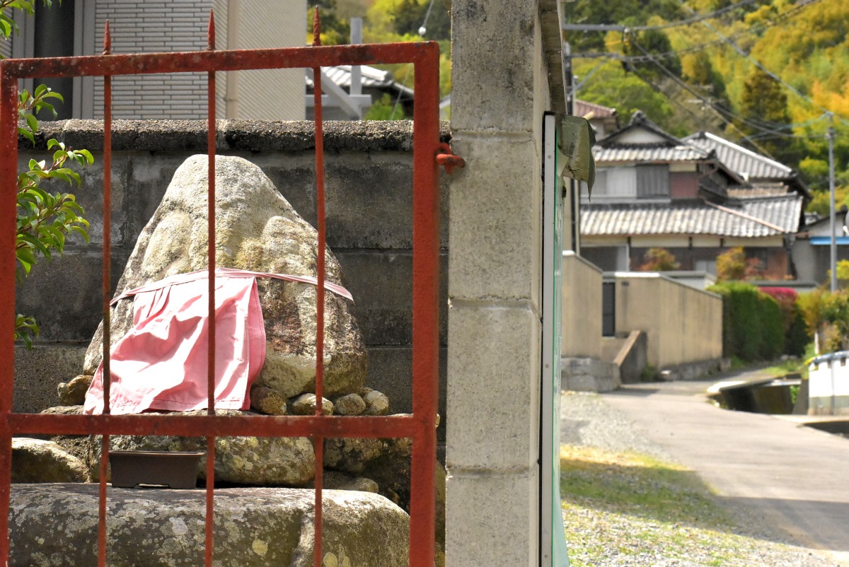 徳寿寺から坂をくだって通りへ出ると、町の一角におにぎりの様な!?三角形の石が祀られています。三角錐の2つの面にそれぞれ彫られた仏様。県内では最古ともされる貴重な二面石仏なんだとか。大切に守られているのが分かります。