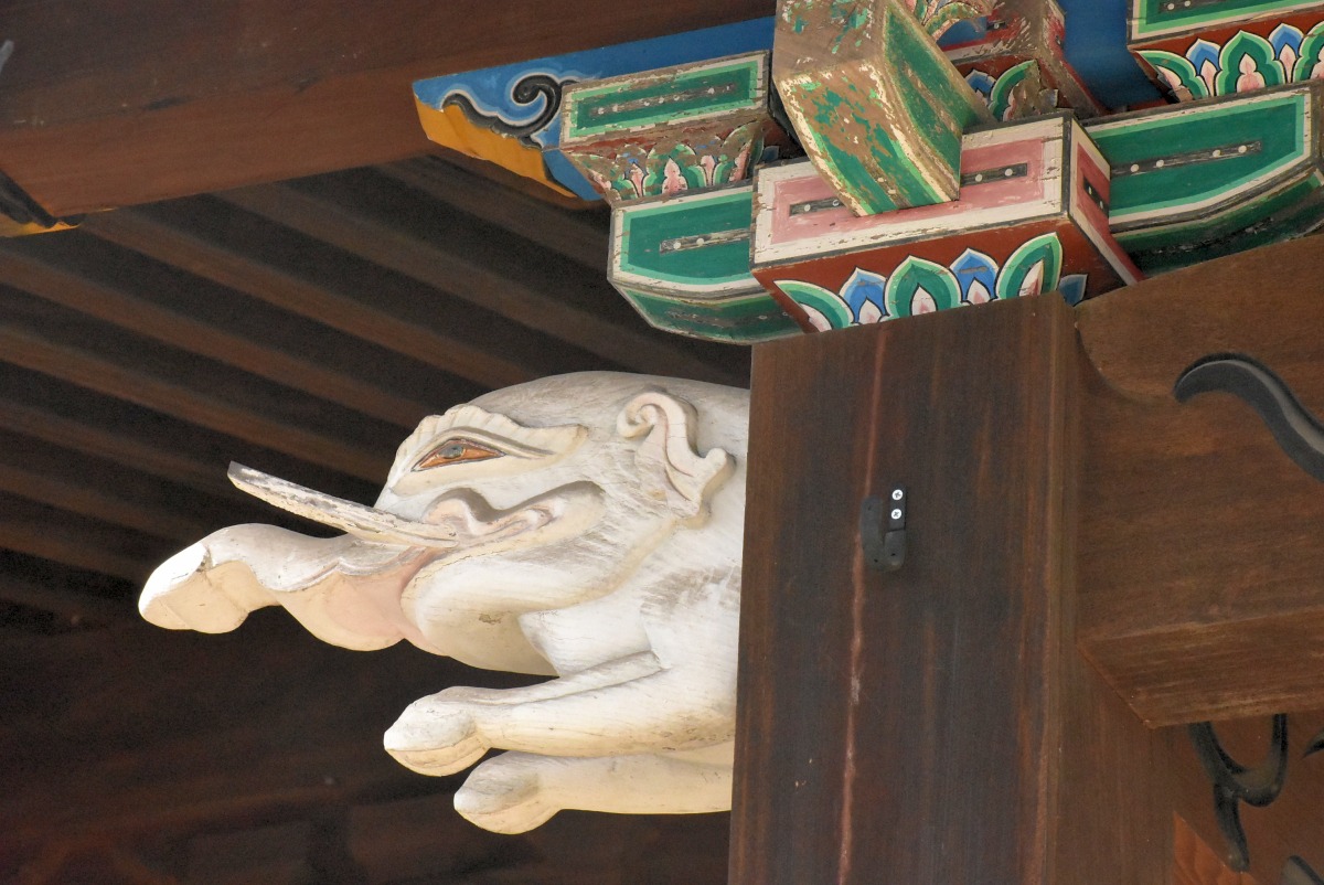 山陽新幹線の高架と県道242号沿いの路地も風情たっぷりです。町の道祖師様「おそっさま」。レトロな東花尻公民館。そして寺院も点在しているので参拝いたしましょう。朱色の門が印象的な「妙博寺(みょうでんじ)」では、本堂の木鼻には聖なる像・白象がほどこされています。赤に緑に青、黄色。色鮮やかでなんともエキゾチックです。