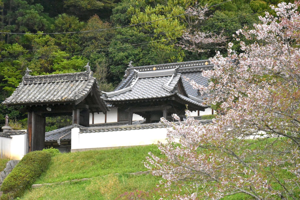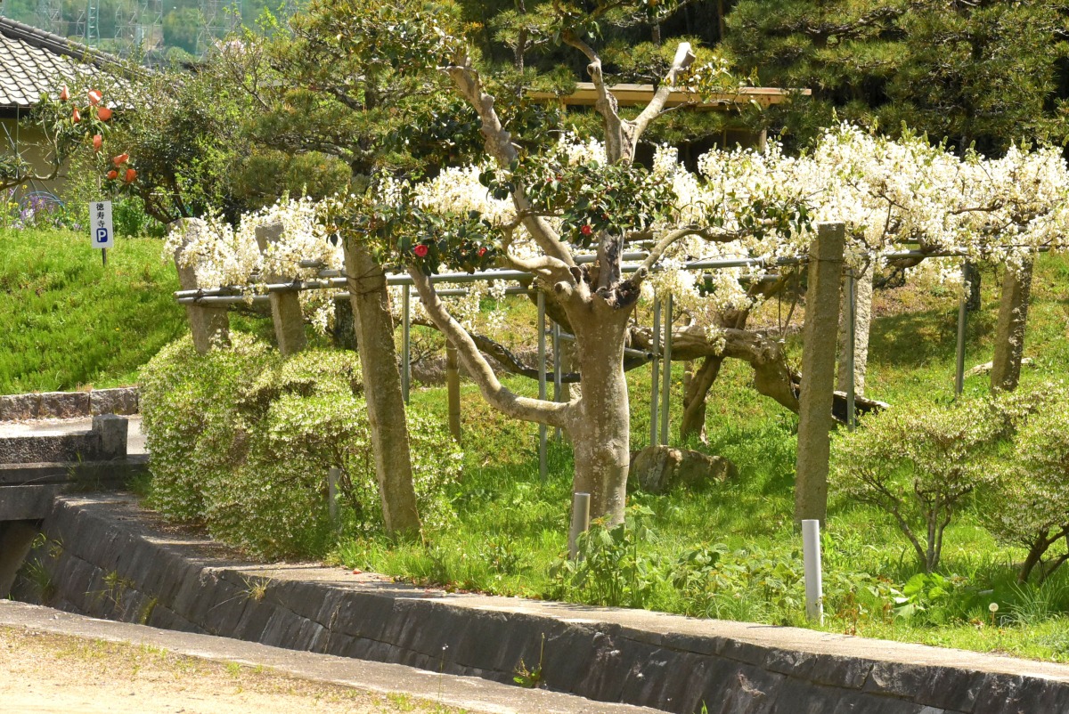 門前には白衣観音像。白く輝くフジの花。6月頃に咲くナナツバキ(沙羅双樹)でも有名な、白い花の寺「徳寿寺」です。仁王門や境内からの眺めも素敵ですよ。少し奥まったところにあるのでお見逃しなく。夏にかけては、アジサイやハスの花も楽しめます。