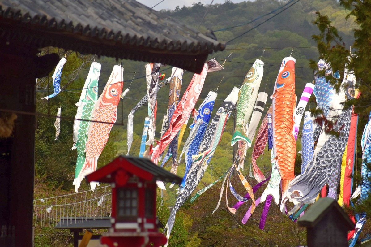 まずは小さな坂(四国往来)の道すがらで、福田海の長床や国境があった両国橋などのスポットを楽しんだら、見えてきました! 「吉備津彦神社」です。こどもの日が近づく4月頃からは、100匹ほどの鯉のぼりが泳いでいますよ。近距離に備前国の一宮「吉備津彦神社」と、備中国の一宮「吉備津神社」という2つの重要な神社があるなんて。さすが神聖なる山、吉備の中山です。