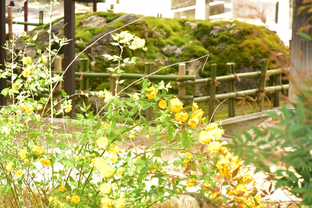 「吉備津神社」に到着です!入り口にある矢置石のそばでは、ヤマブキの花が鈴なりに咲いていました。国宝の本殿拝殿。山裾にのびる回廊。吉備国の総鎮守の境内では、ツバキやボタン。アジサイにツツジなど。四季を通じて美しい花々もたのしめますよ。