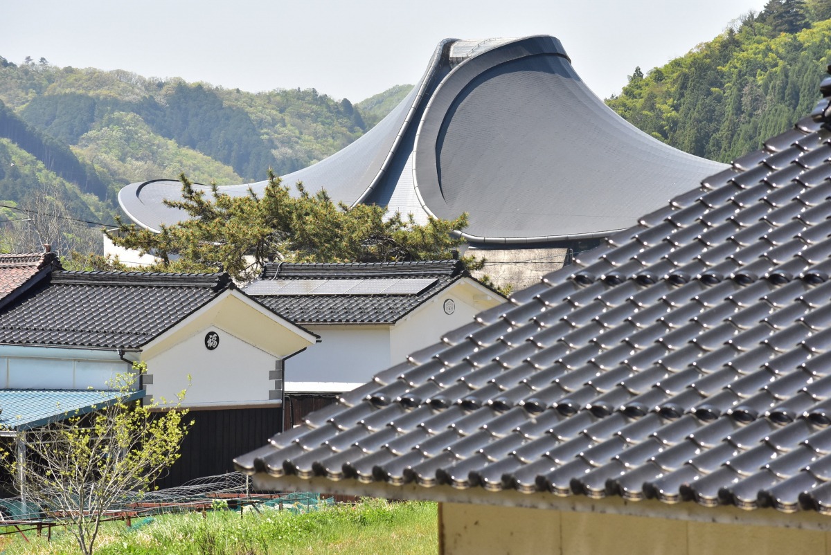 真っ白な火の見櫓に、真っ赤な消火栓。「ん!?なんだあれは?」。家々のむこうに黒く巨大な建造物が。武蔵作の刀のつば(鍔)として有名な、海鼠透鍔(なまこすかしつば)がモチーフの武道館です。なかなかの反り具合だな。