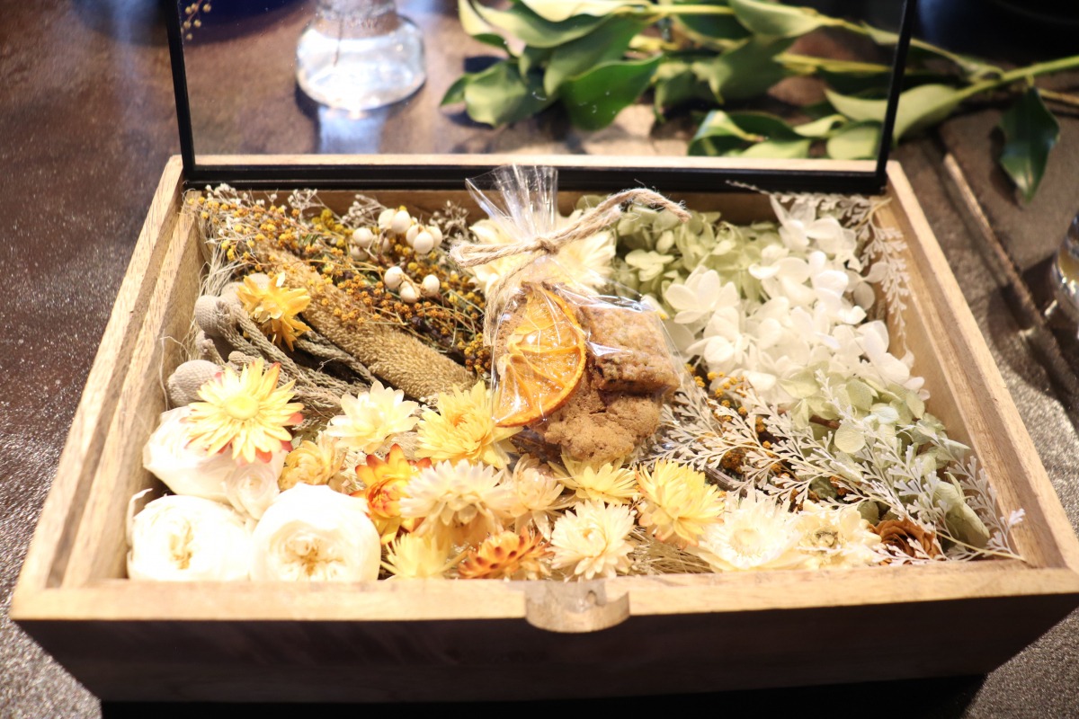 「ご馳走様でした」といった矢先に、ドライフラワーでデコレーションされた木箱にのせられて焼き菓子が登場! なんとお土産だそうです。すでにお腹はパンパンですが、家に帰ってからも余韻に浸れそうな気がしました。心をくすぐるサービスがたまりません。またリピートしたくなりました!