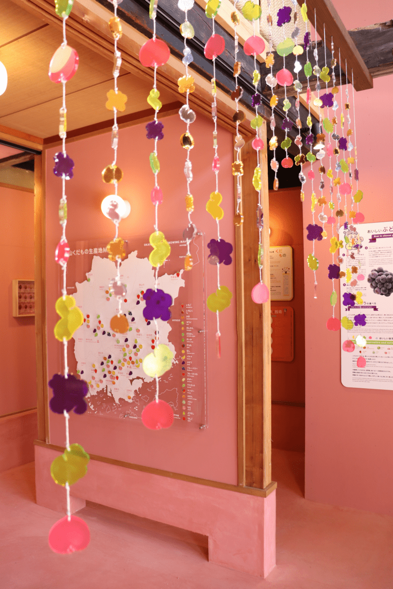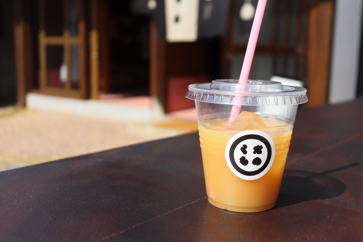 フルーツ王国である岡山県の美味しい桃やブドウのジュースを年中テイクアウトで飲むことができます。規格外の桃やぶどうをジュースにして、無駄なく加工にしているそうです。ドリンクとして一番おいしい80%果汁に薄めて作られているので、飲みやすかったです。中庭のテラスは、犬をつなぐホルダーも完備されていて、犬と共にくつろげる空間になっていました。