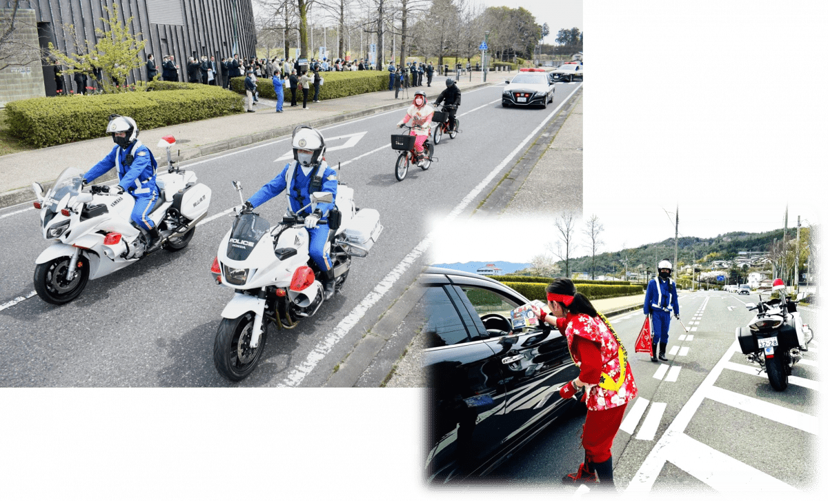 2024年は「春の交通安全県民運動」の津山署管内の推進大会に参加。地元の園児たちと交通安全体操をしたり、「津山シェアサイクル・ごんちゃり」に乗って交通安全パレードにも参加するなど、ドライバーに無事故を呼びかける啓発活動を行いました。