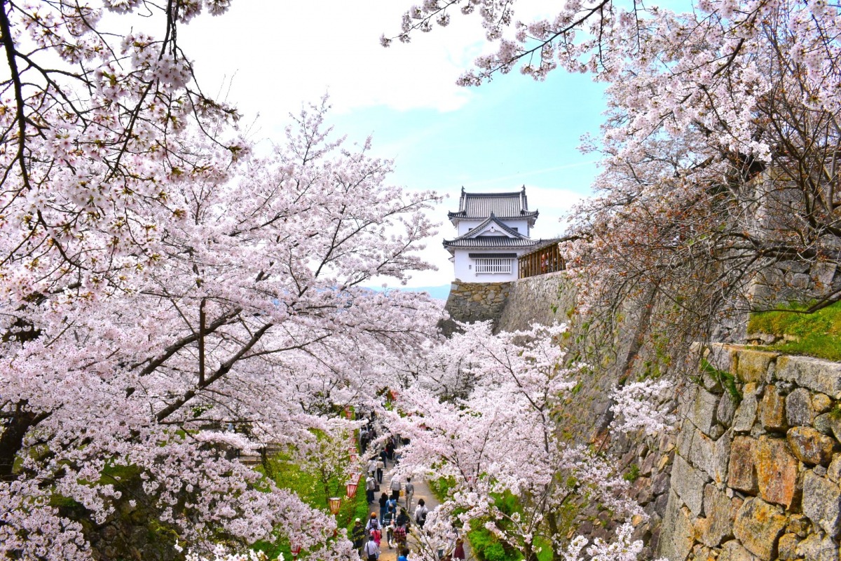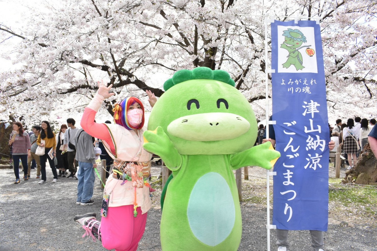 津山城は岡山県でも有数な桜の名所。3月末から4月初旬にかけて 津山さくらまつりが開催されます,桜と石垣のコラボは最高の景色です。毎年、作州忍者鶴山隊による忍者迷路が本丸に設置されて子供たちに大人気となっています。また今年(2024)から本丸に高所作業車が設置され、地上20mから桜を見下ろすことができる空中散歩も大人気でした。
