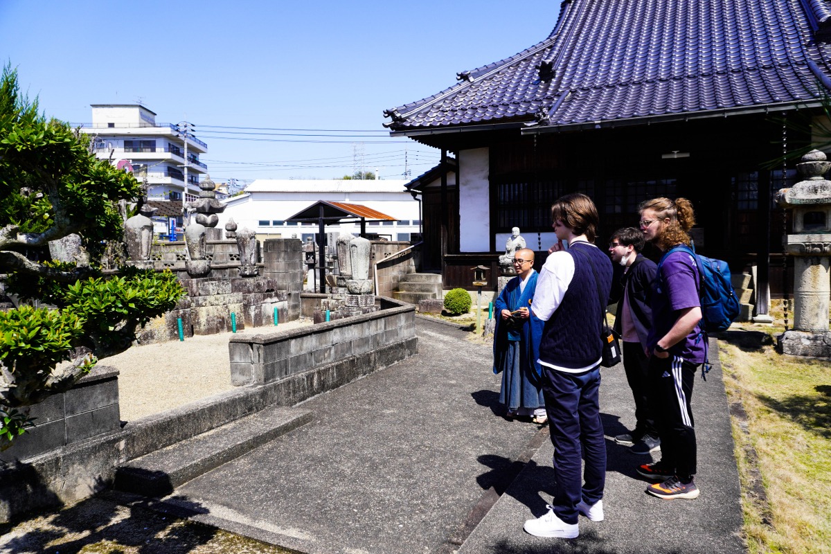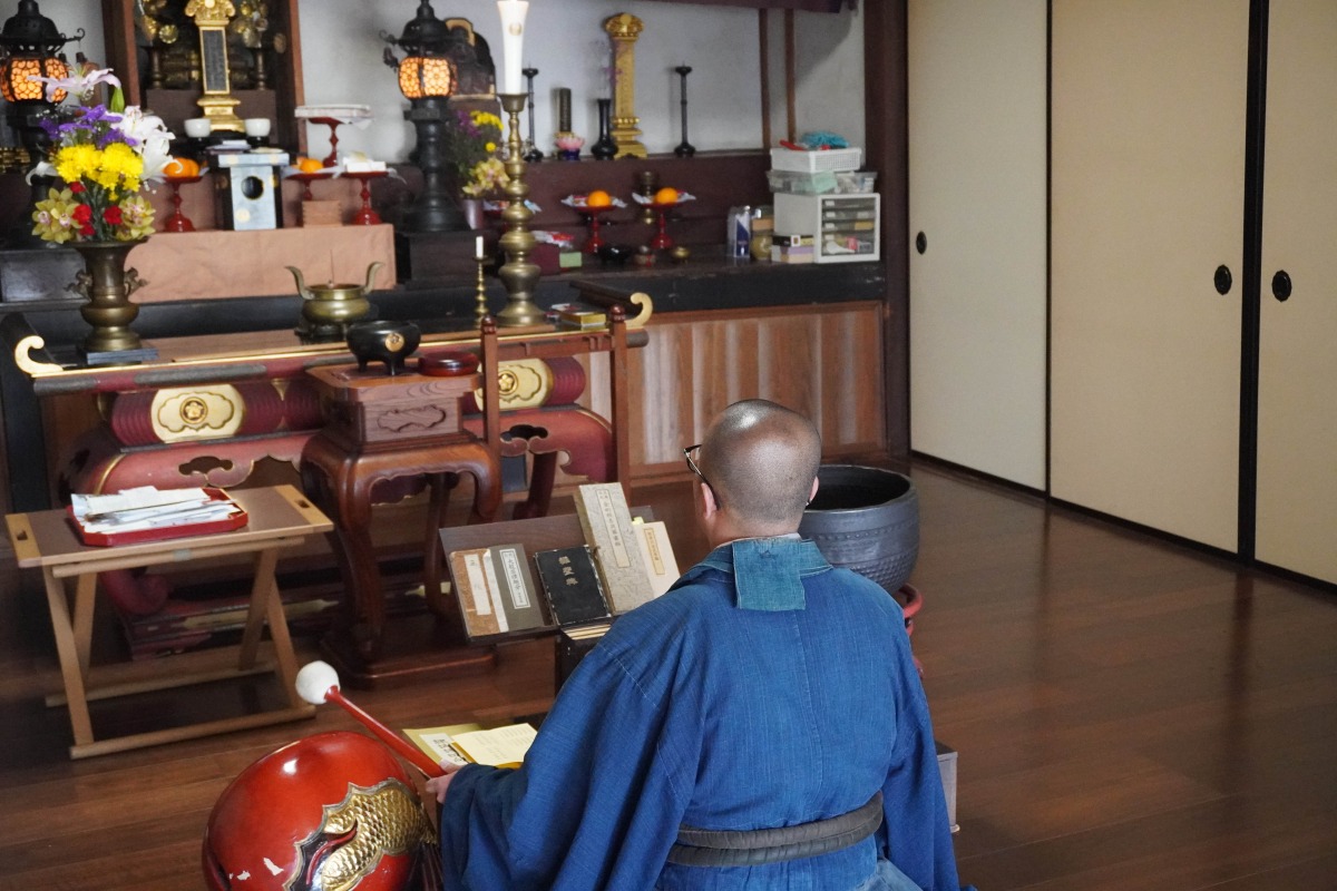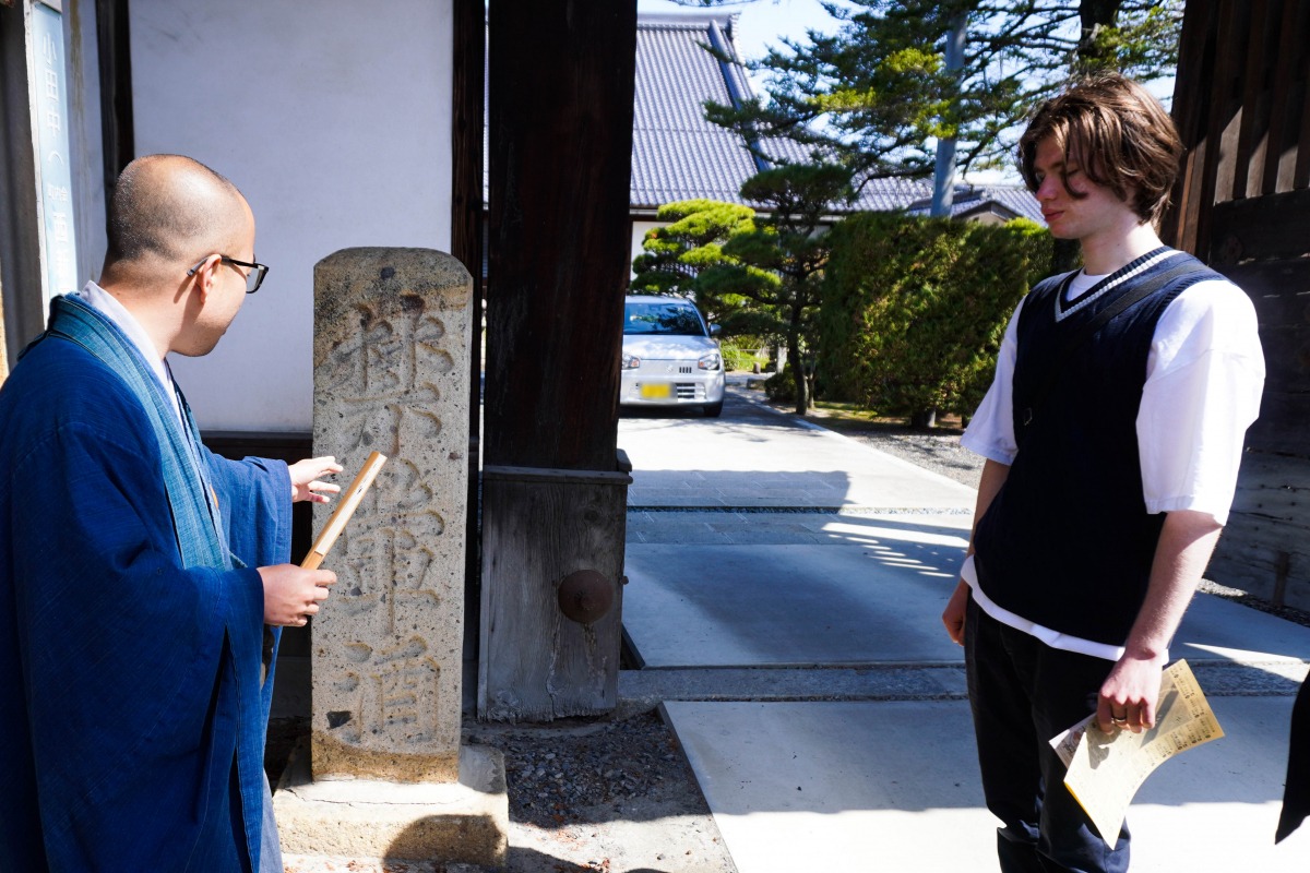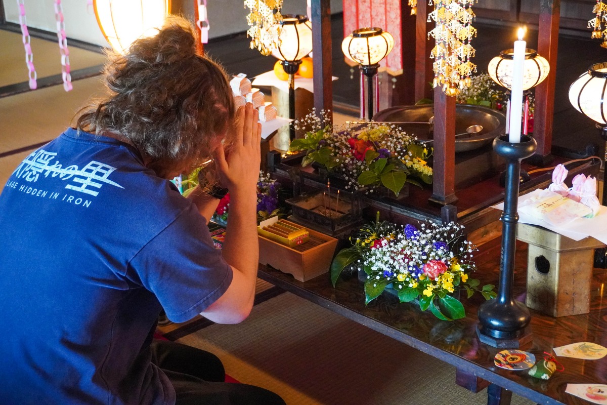 外国から来ている彼にとっては、仏様に手を合わせるのもはじめての貴重な体験。作法を学びながら、見よう見まねで拝んでいました。