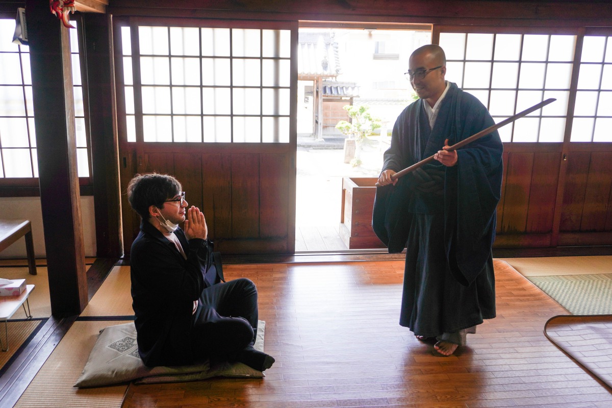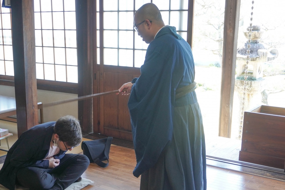 実際に警策で背中を打ってもらいました。想像していた以上に、ズシンと衝撃があり驚きました。本当の修行ではもっと強く叩かれるときいて、さらに驚きました。