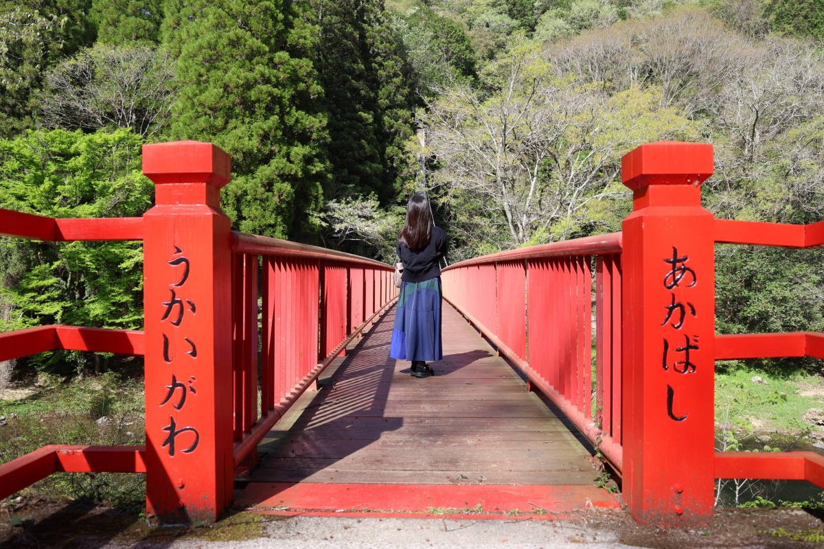 宇甘川にかかる赤橋。下を見ると足がすくみそうですが、怖いけれど渡ってみたくなる魅力があります。