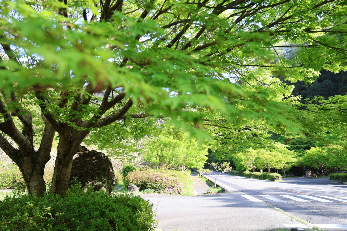 駐車場周辺も新緑のモミジが美しく、見頃を迎えています。川柳の小道もあり、石碑に刻まれた川柳が点在していて、楽しみながらめぐることができます。