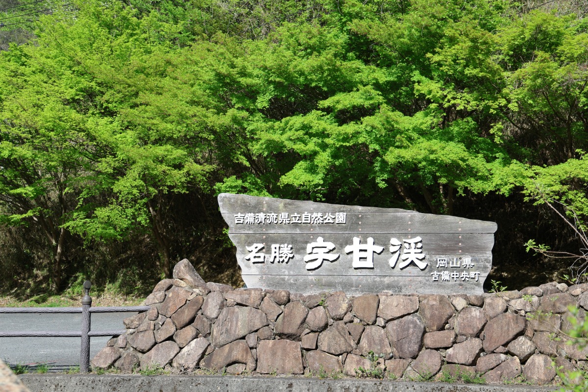 岡山三大河川のひとつである旭川の支流、全長5kmの宇甘渓(うかんけい)は、吉備清流県立自然公園に指定されており、四季を通じて様々な自然の表情を楽しむことができる場所です。駐車場側から見るシンボルの赤橋もより映えて見えました。
