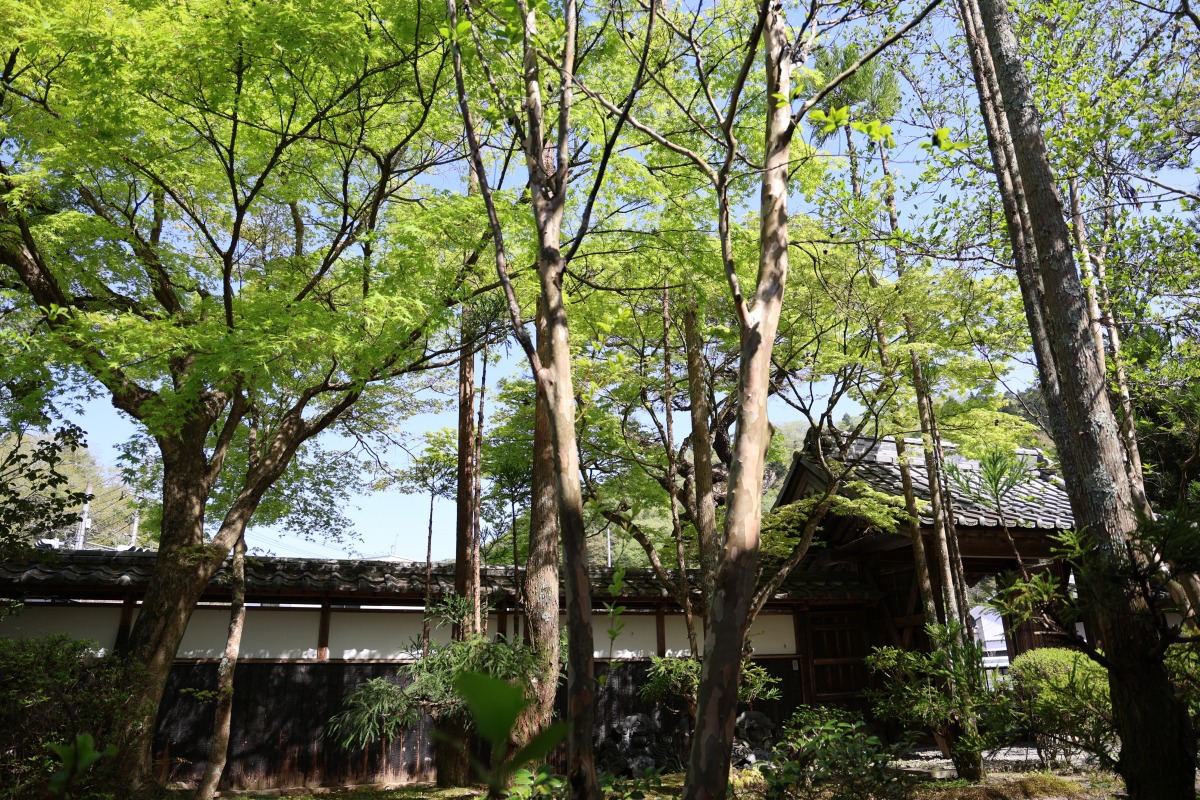中庭はきれいに手入れされていて、イロハモミジの新緑が見頃できれいでした。秋になれば紅葉がきっと見事だと思いました。