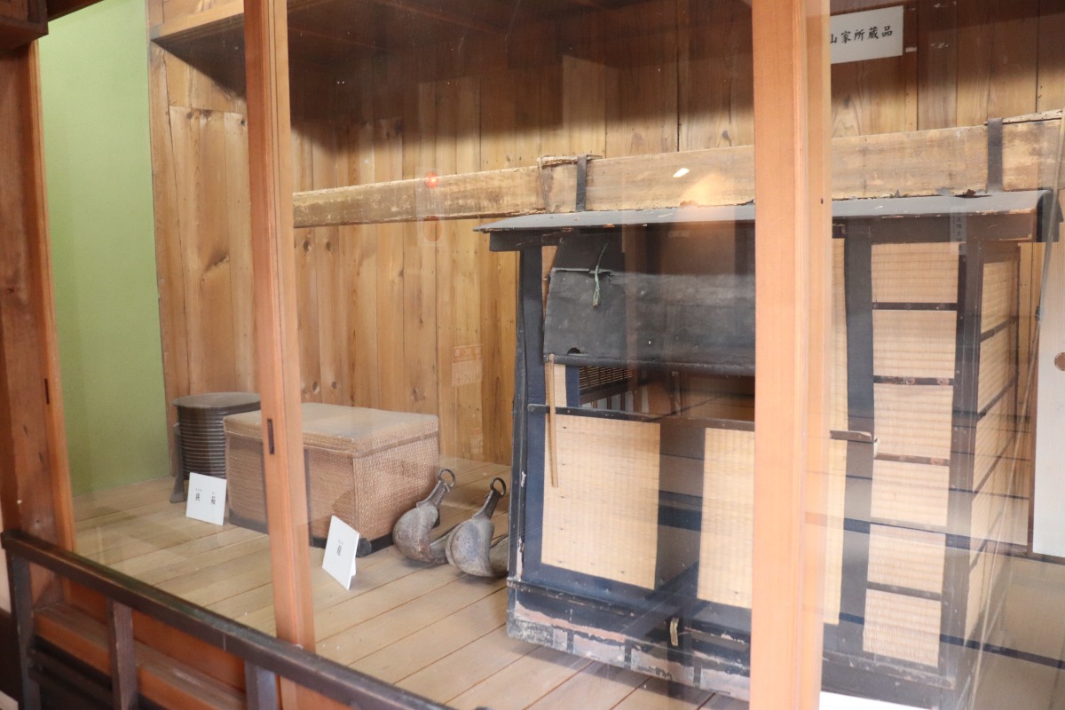 2階に上がると、片山家の歴史がわかる展示品があり、所蔵されていたものが見られます。大きな籠が展示されていて、江戸時代にタイムスリップした気分になります。官吏、漢学者の片山朝太郎と繁の長男として生まれた片山重範の時代の屋敷で、百年の歴史が流れてきたことがうかがえます。