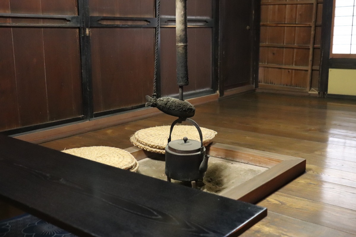 興味深い部屋を見つけました。思いがけない侵入者に対し、客人、家人を避難させるために、階下からの入り口を分からないように工夫した隠し部屋です。薄暗いですが、意外と広くて、過ごしやすそうな畳部屋になっていました。