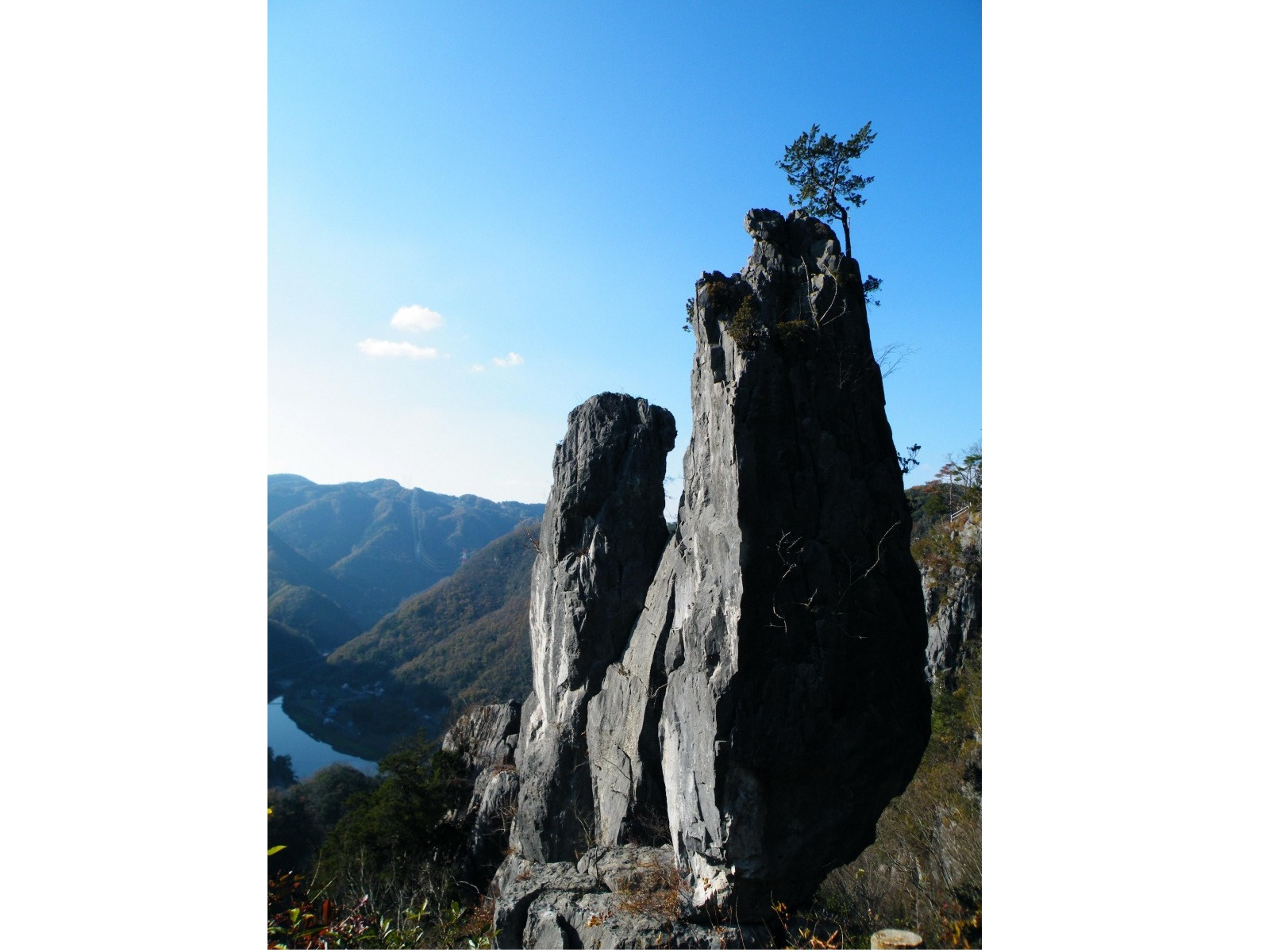 標高400mの石灰岩の台地上にそびえ立つ三つの大塊です。夫岩は高さ12m、妻岩は高さ16mで愛児のような岩を抱いています。必見は下部が細い“くさび”のような形の夫岩で、絶妙なバランスによって支えられています。夫婦岩を両方向から見ることができる展望台も整備されているほか、近くには夫婦円満、縁結び、家内安全を祈願する社『鬼の村夫婦岩神社』もあります。