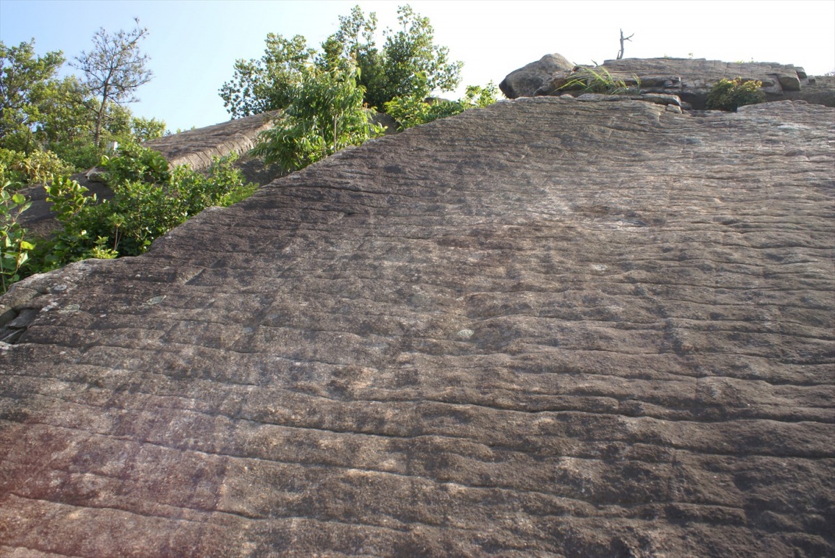 白石島の「鬼ヶ城」山頂近くに花崗岩を貫いて噴出したアプライト岩脈です。基盤の目のような割れ目が表面に張り付いている形状が、大男が着る鎧の袖のように見えることから「鎧岩」と呼ばれています。国の天然記念物にも指定されています。