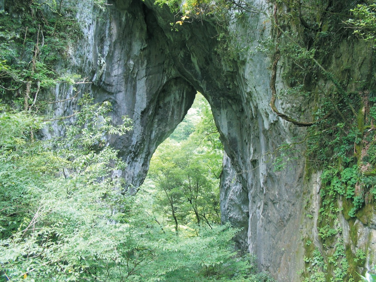 標高400m前後の草間台地にある天然橋。太古の時代に地下の大洞窟が一部を残して陥没してできた、高さ40mに達する石灰岩の巨大アーチで、上部は4つの橋になっています。周辺は高山系や北方系など珍種のコケの宝庫でもあります。