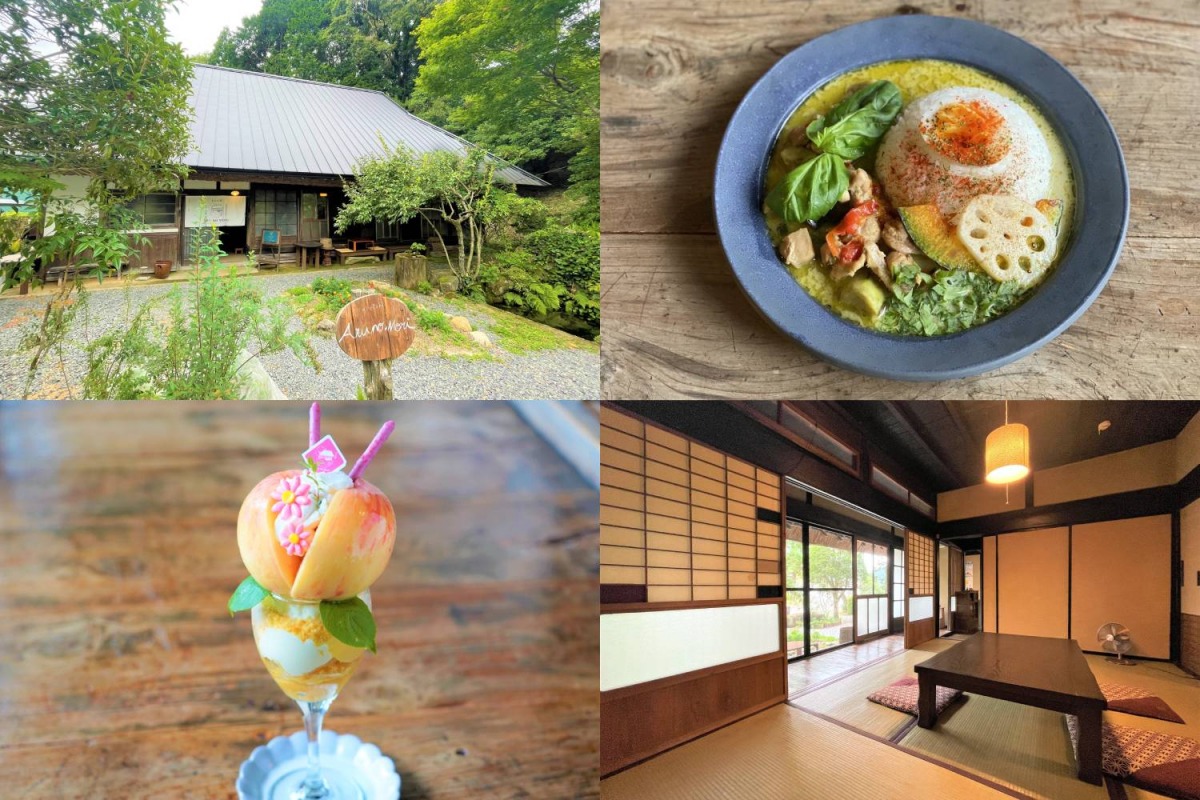 日本人とタイ人の夫婦が営む古民家カフェ。築約130年の茅葺トタン屋根の建物で、グリーンカレーやカオマンガイ、ガパオライス、パッタイといった、本格タイ料理が楽しめます。ブルーベリー、さくらんぼ、びわ、桃、イチジクなど、旬のくだものを使ったパフェも人気。民宿としても営業しており、カフェが終わった後、各部屋は客室やリビングになります。