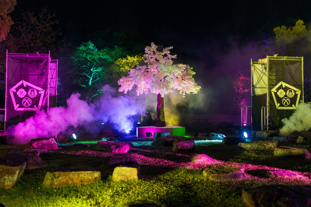 造花の一本桜はライトアップの色合いが変化し、スモークによって一層ファンタジックな雰囲気となって目が離せません。