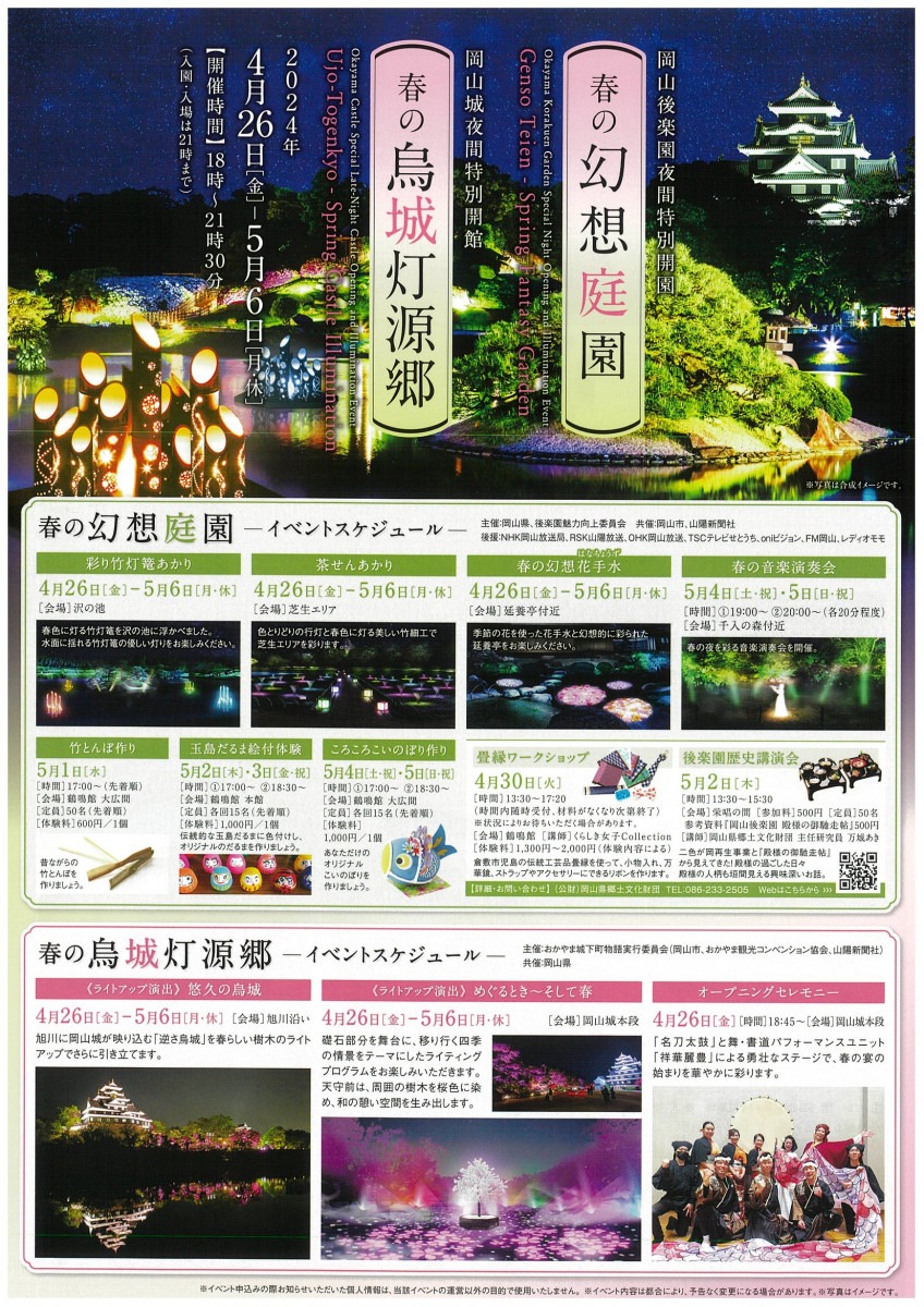 春の幻想庭園・春の烏城灯源郷とは、それぞれ岡山後楽園・岡山城で開催されるライトアップイベントです。