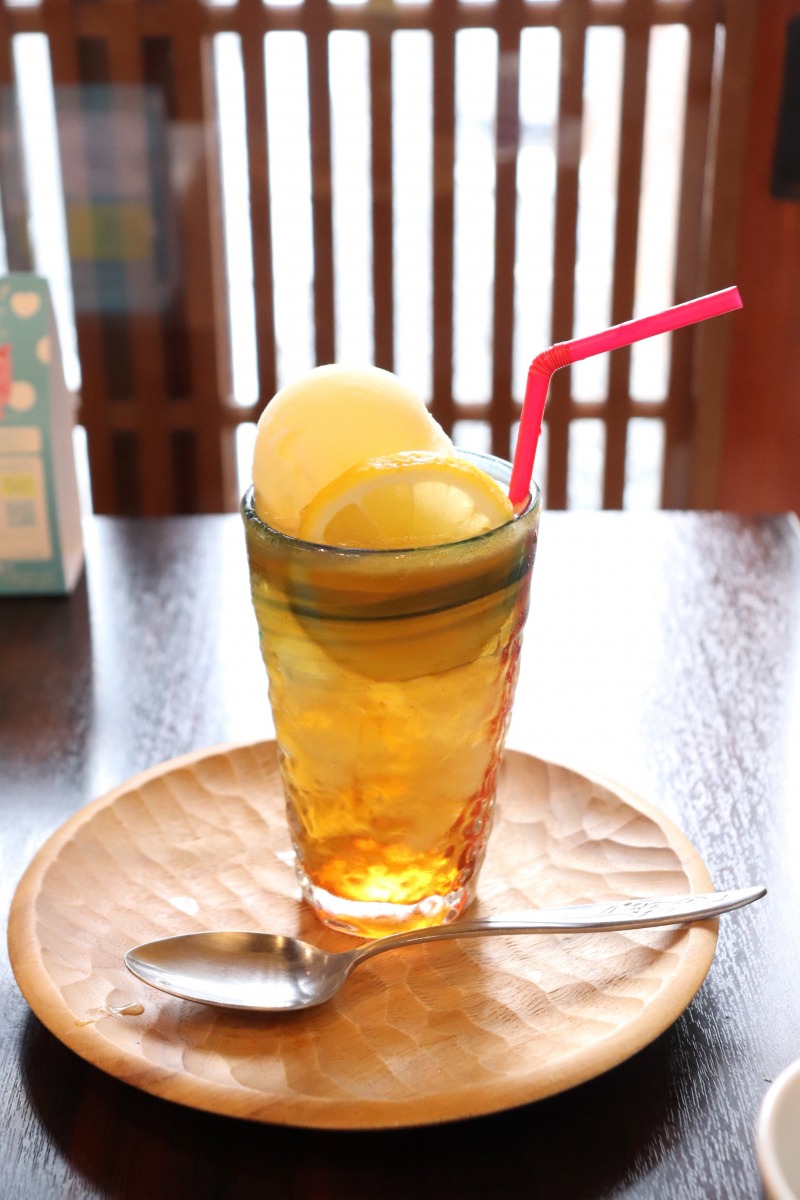 レモンを丸ごと1個贅沢に絞ったフレッシュ果汁と、コクのある黒蜜、メイプルシロップを使ったソーダに柚子シャーベットがのった「シーズ藤原家」のクリームソーダ。シャーベットだけでもボリュームがあり、柚子を存分に感じました。さっぱりとしたシャーベットにコクのあるソーダがいい感じに溶け合っていました。(700円/1日12杯限定)