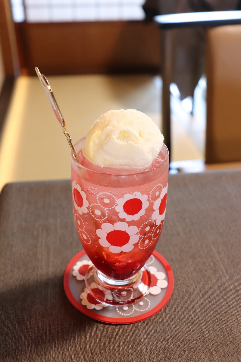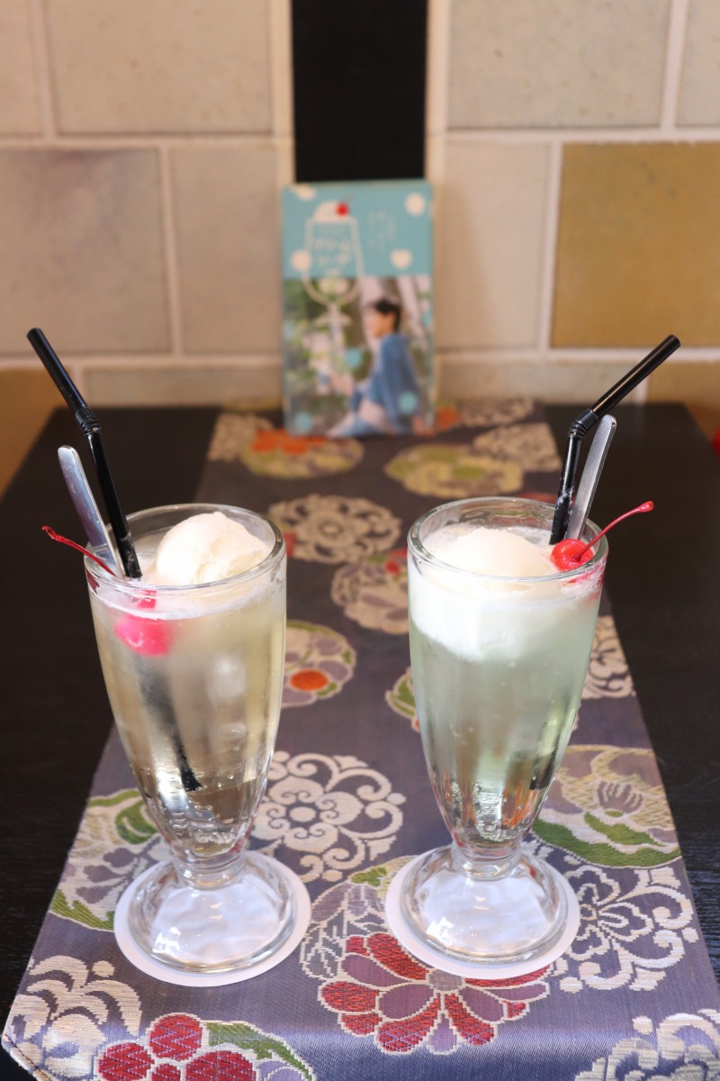 味は他にも、白桃、マスカットがありました。100年前の古民家、大正ロマンの雰囲気漂う店内でレトロなクリームソーダがよく映えていました。(800円/数量限定)