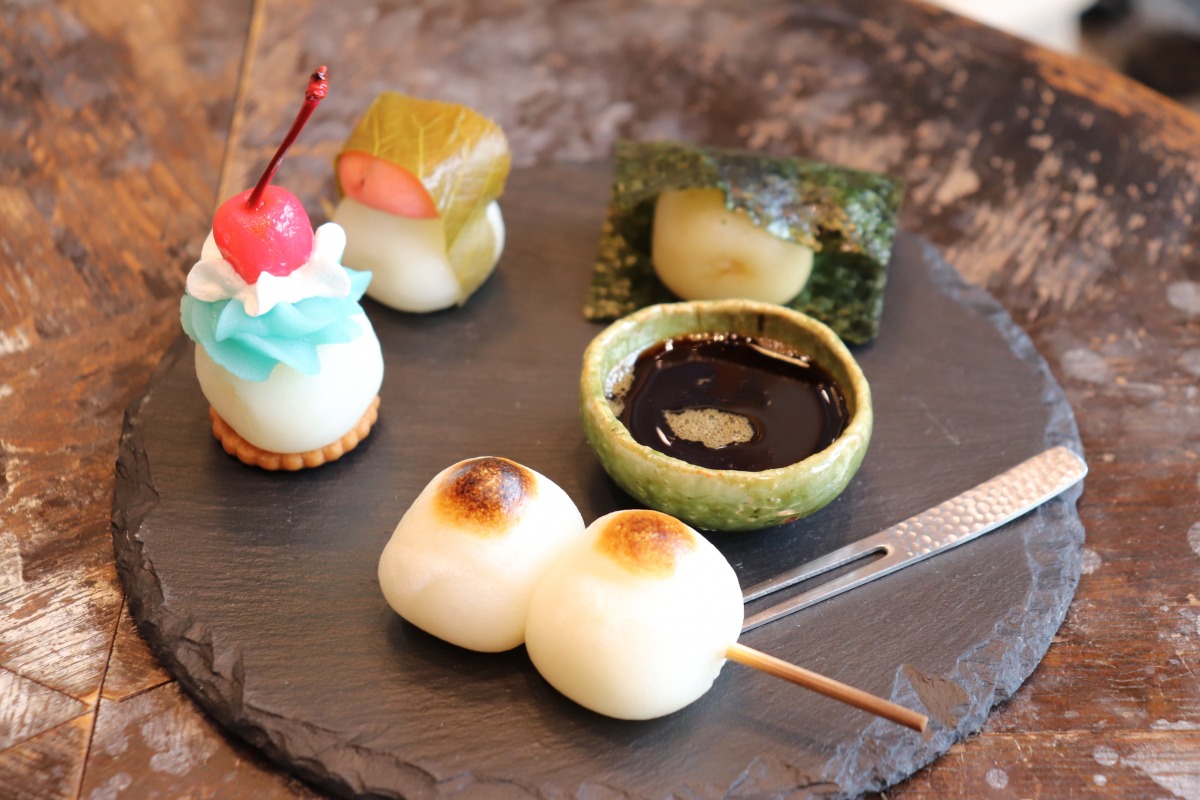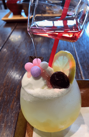 南高梅のソーダにクリームチーズアイスが浮かんでいて、ダークチェリー、チョコレート、おいりのトッピングが華やか。そのまま飲んでもさっぱりとして大人の美味しさですが、お好みで赤梅シロップをかけると味と色の変化が楽しめます。グラス自体がゆらゆらガラスなので持ち運び要注意です。(935円)