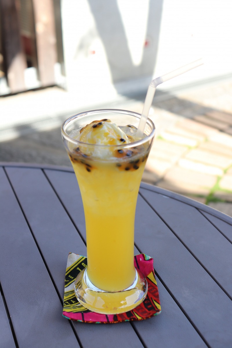 矢掛産パッションフルーツの自家製ジャムとシロップのクリームソーダにバニラアイスがのっています。南国を感じるさっぱりと甘酸っぱい味にバニラアイスがマイルド感を出しています。バニラアイスを混ぜて飲むとまた違う味が楽しめます。パッションフルーツの粒でも南国感が楽しめます。(700円)