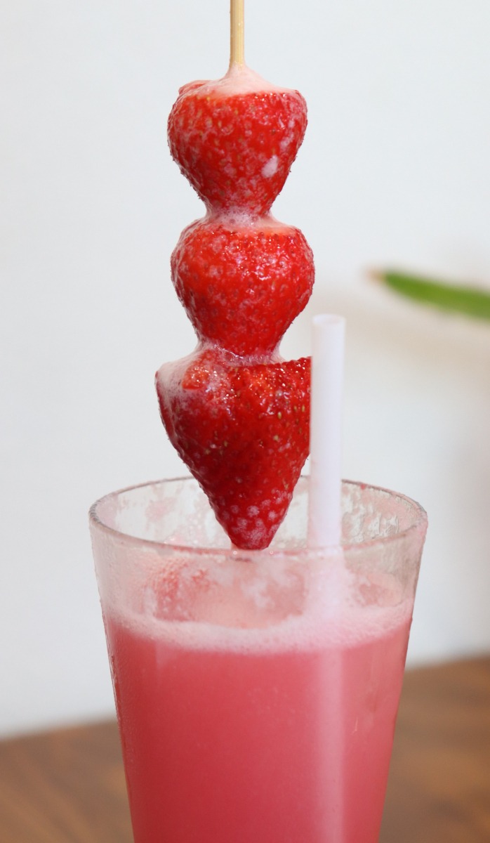 道の駅から車で約8分の所にある「水車の里 フルーツトピア」。季節を通じてフルーツ狩りやバーべキューができる施設です。農園でとれたての新鮮いちごを使って作った、アイスクリーム、ゼリー、シロップが入っているクリームソーダです。いちごは5つ入っていますが、3つは串にさしてグラスの中に入っていて、サプライズ感満載でした。1日15杯限定。(650円)