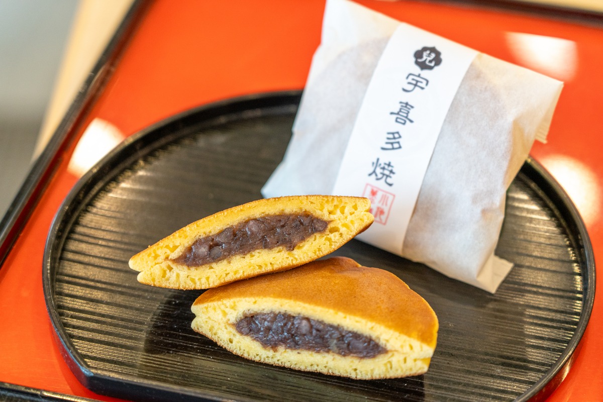 県道倉敷児島線沿いにある老舗和菓子屋「小池菓子舗」。こちらでは早島みやげにぴったりの「宇喜多焼」なるお菓子に出会えます。岡山県産の米粉を使った生地はもっちりしっとり。間には上品な甘さの備中大納言あずきの粒あんと刻んだ栗がはさまれており、食感もあわせて楽しめるどら焼きです。1個240円。