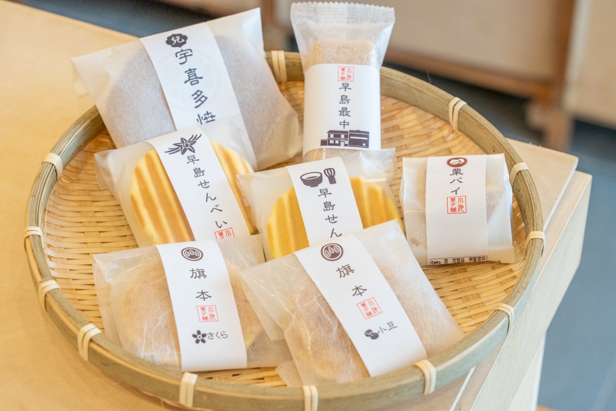 ほかにも人気商品がずらり。パッケージに旗本・戸川家の家紋である三本杉が入った「旗本(170円)」は、平たく焼いたさっくり食感の生地に餡をはさんだ焼菓子。小豆の他、抹茶やさくら、ゆずなど、色々な味があります。「早島せんべい(160円)」、「早島最中(190円)」、「栗パイ(190円)」をはじめ、生菓子や旬のフルーツの大福、季節ごとのイベント菓子も並んでいます。