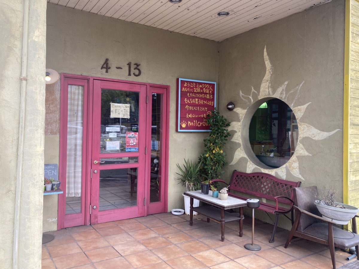 ピンクの扉が可愛い「ミルクラウン」は、手作りのパンやスイーツが豊富に揃うお店。店内は明るく清潔感があり、焼き立てのパンの香りが漂っていました。