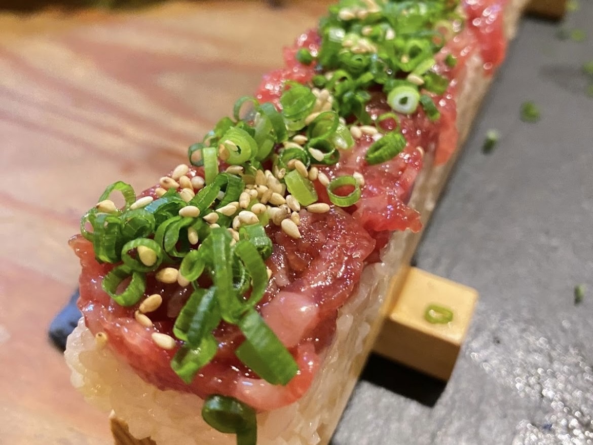●お肉好きにはたまらない。ユッケ寿司、牛むす、ひとくち餃子とすじ煮込みなど、お肉メインのメニューばかり。兎に角、なんでも美味しい!岡山・津山名物の干し肉も絶品。(20代/女性・会社員)