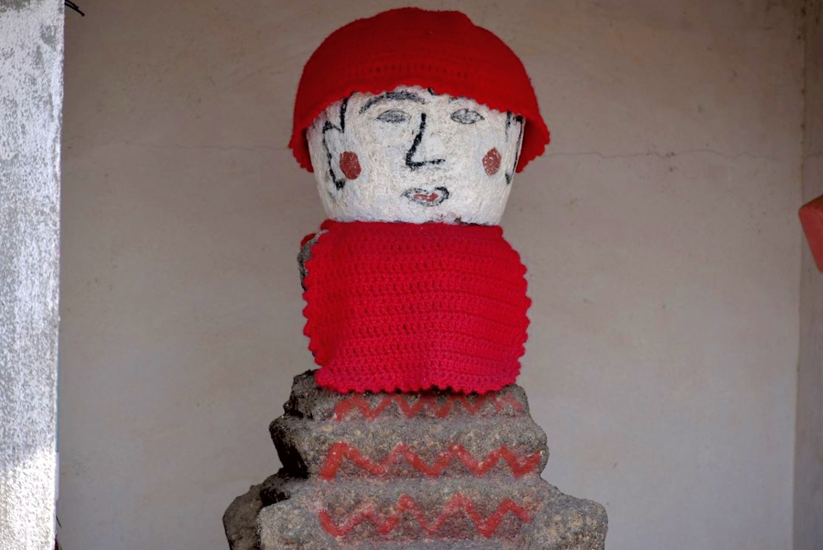 弥勒菩薩のような、立て膝に半分足を上げた「半跏」(はんか)のポーズの化粧地蔵さまには、胸上の港をのぞむ丘の上で出会えました。鎌倉の大仏さまのようにあぐらをかいたお地蔵さまと、2体ならんでいます。パッチワークの前掛けに、渋いニット帽。目じりと鼻すじのメイクがちょっぴり濃いめ?でしょうか。