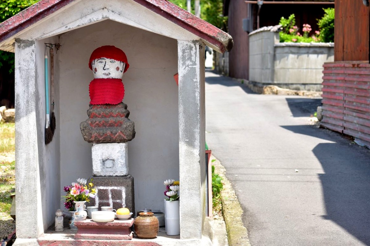 お地蔵さまの祠のむこうは瀬戸内海! 半島のつきあたりの集落なので、秘境感もあじわえますよ。石のお地蔵さまに化粧をほどこすというこの風習。起源は定かではないようですが、京都方面から伝わったのでは?と言われているんだとか。