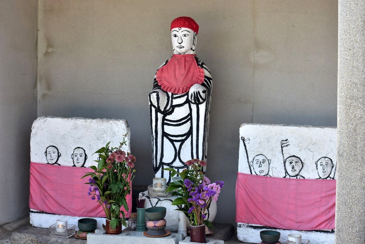 「沼」と書いて「ぬ」と読む、なかなかパンチがある珍しい地名です。丘をくだって半島のつきあたり。美白にも程がある、化粧地蔵さまです。JR宇野駅舎のアート作品を彷彿とさせる!?白と黒の前衛的なお姿をされています。