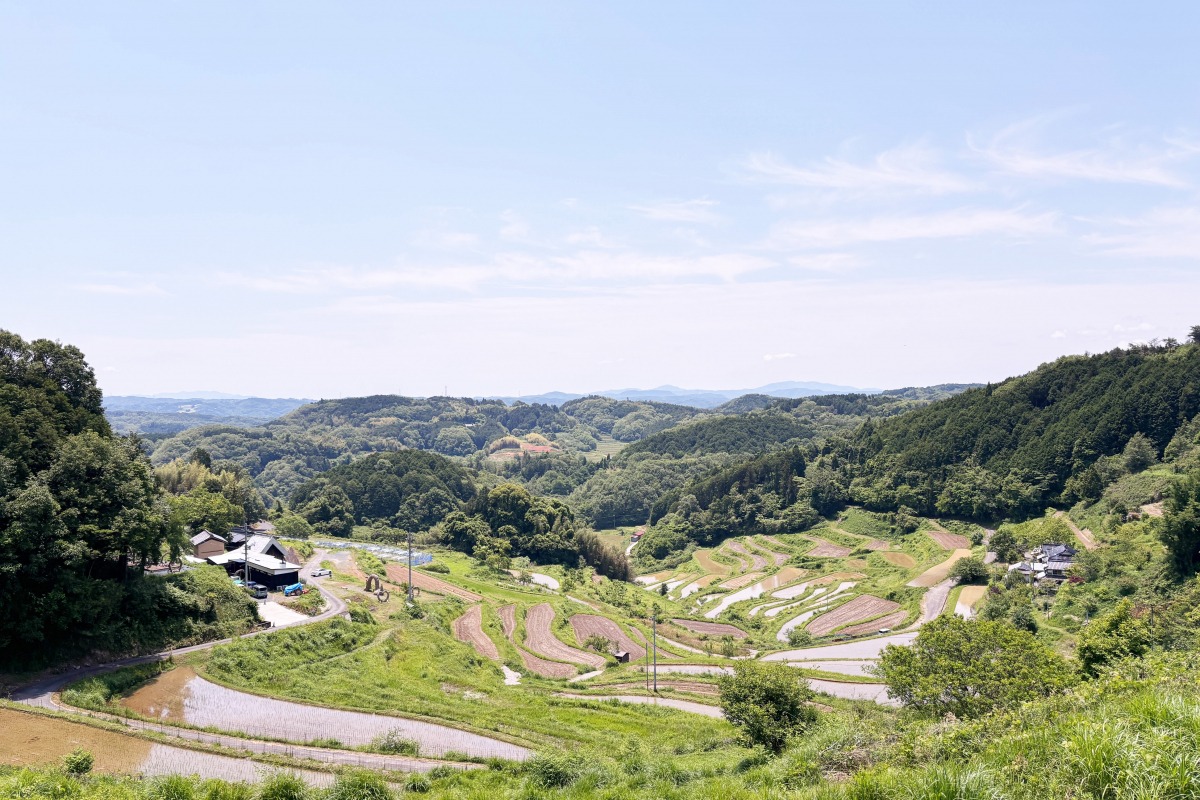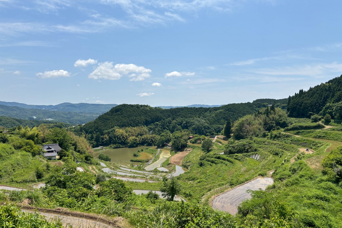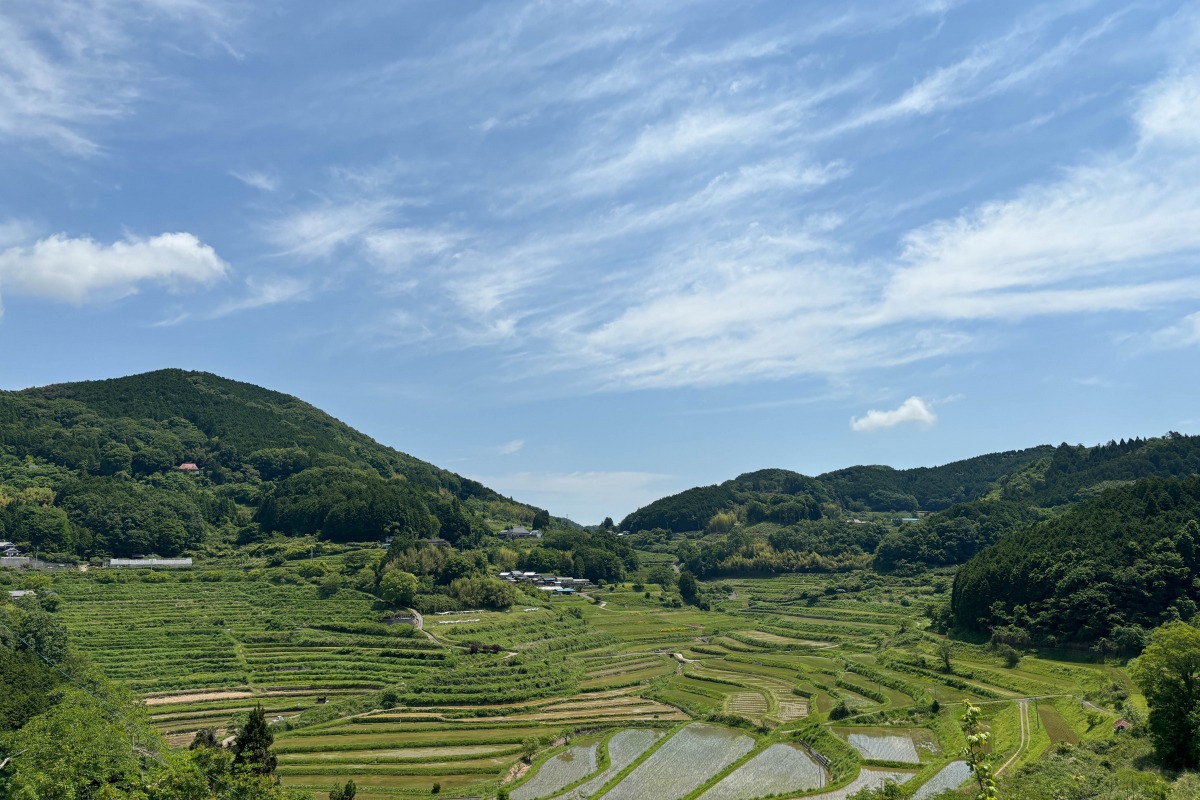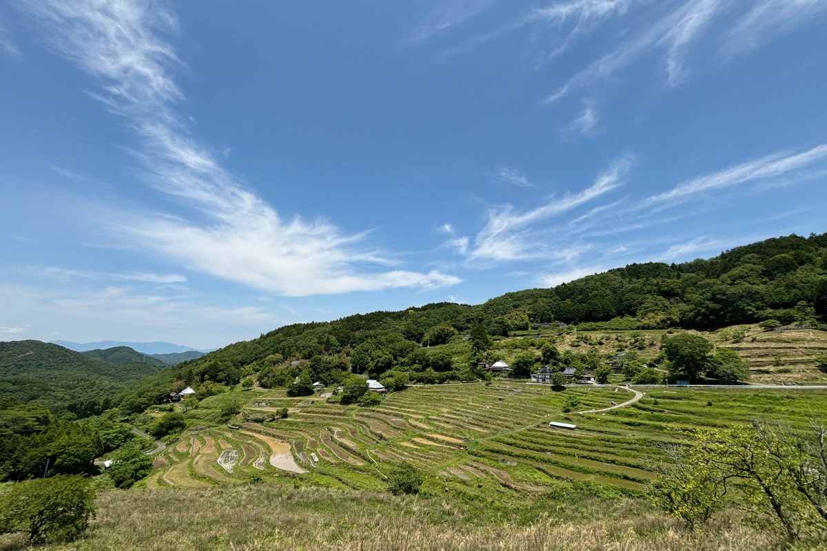上から見下ろすと、たくさんの棚田が連なって見える上籾(かみもみ)棚田。遠くに見える山々、広大な空の風景も美しい棚田です。この場所で吸う空気が新鮮でとても美味しく感じました。