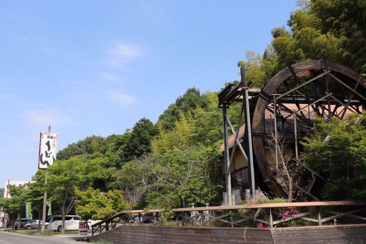 道沿いに建つ大きな水車が目印